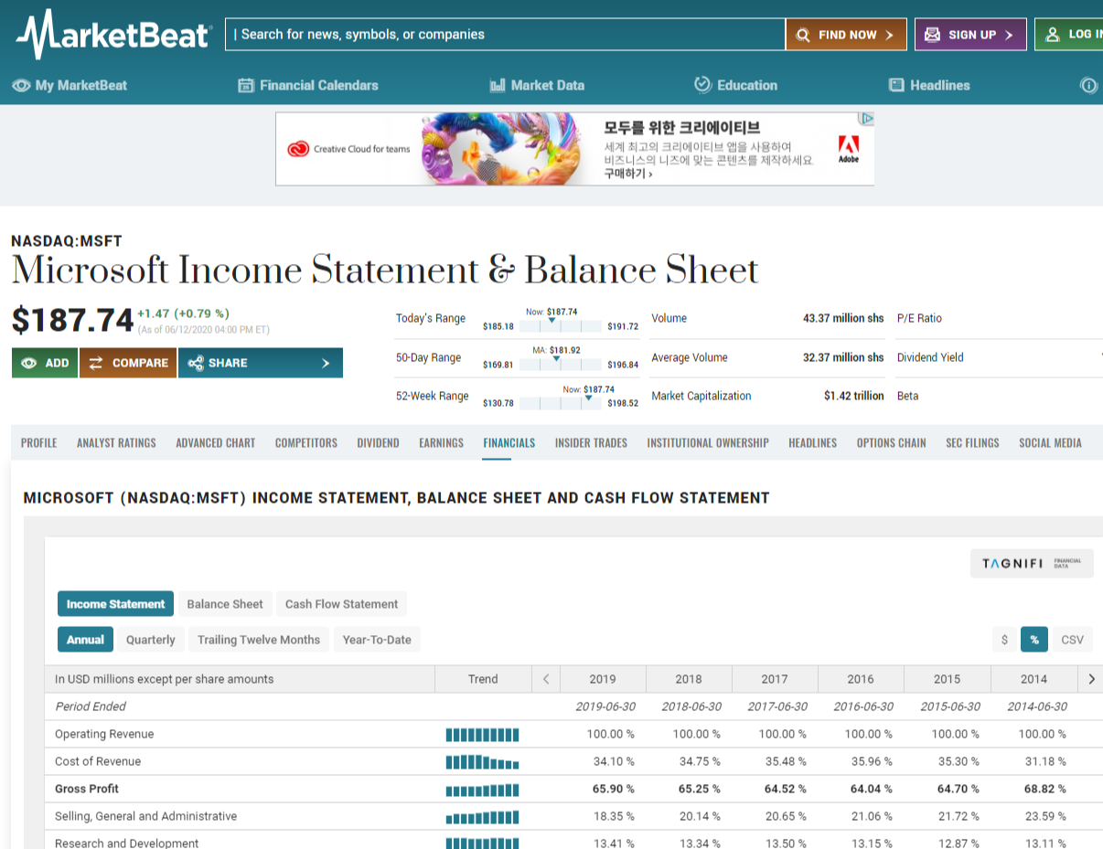 티커를 입력하고 '파이낸셜'에 들어가면 연간 리포트를 볼 수 있는데,