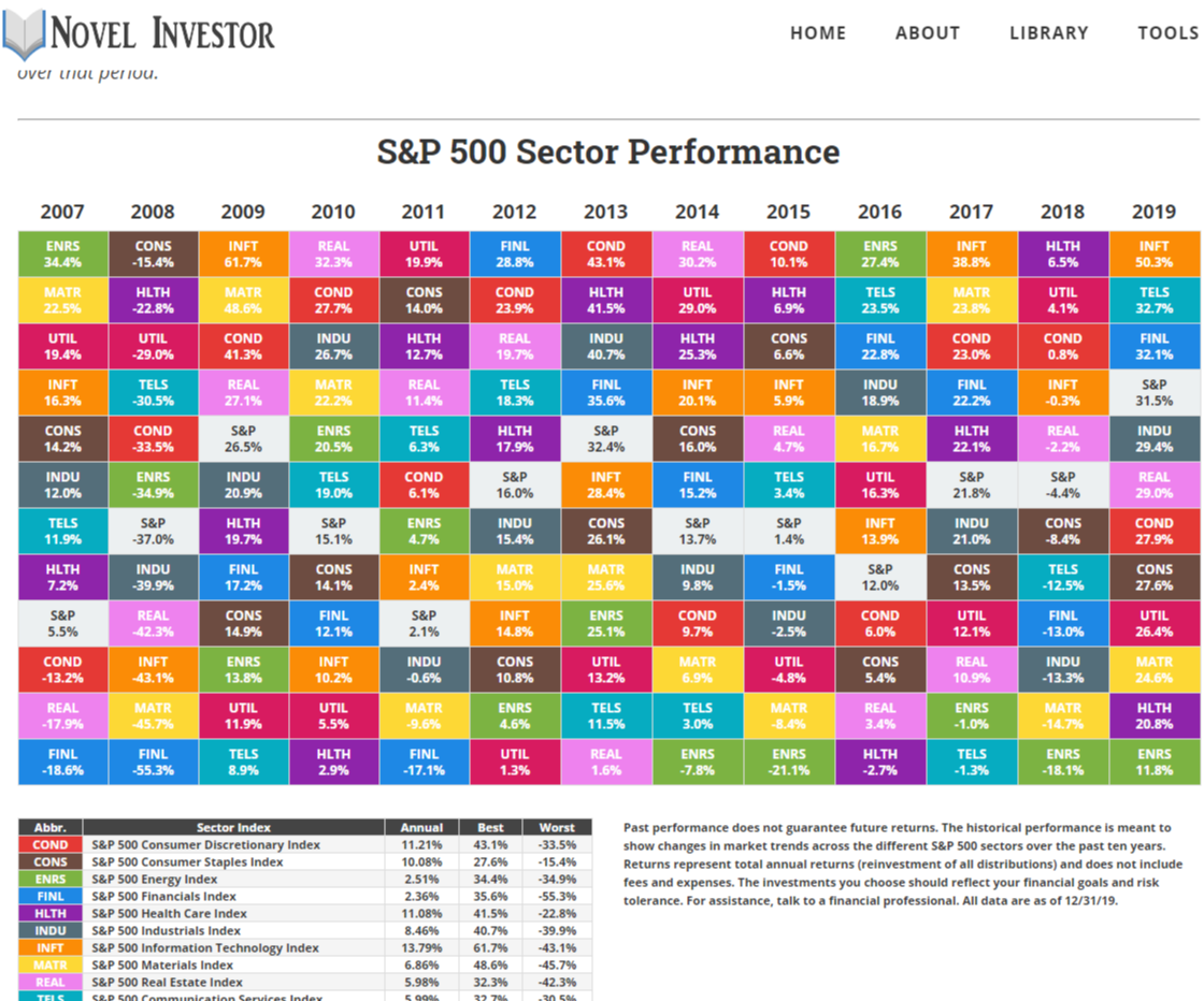 S&P500의 업종(섹터)별 연간 수익률을 한눈에 볼 수 있는 페이지